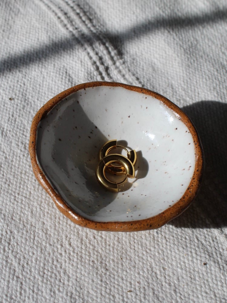 This small ceramic pinch pot is the perfect blend of simplicity and function. Hand-formed and uniquely shaped, it’s just the right size to hold rings, earrings, or other tiny keepsakes.