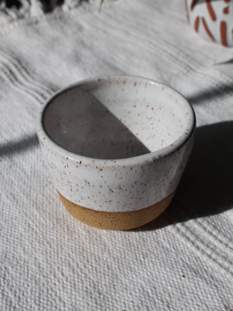 Handcrafted from a warm, speckled stoneware clay and finished with a smooth white glaze, this small cup brings a simple, earthy elegance to your daily rituals. Its compact size makes it perfect for espresso, sake, tea, or holding small items like matches or jewelry.